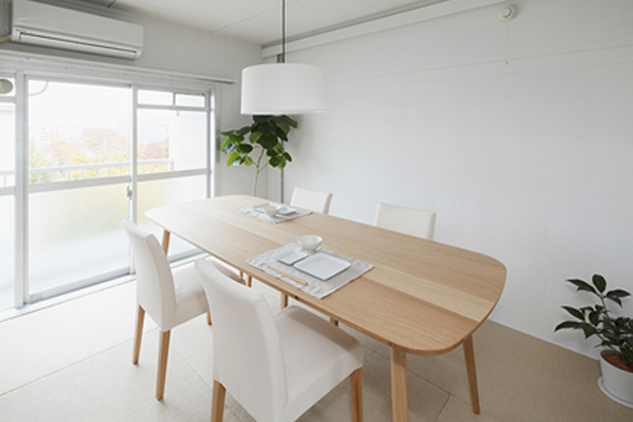 そこで、MUJI×UR 団地リノベーションプロジェクトでは、麻畳という新素材の畳を開発しました。麻畳は表面が強いので、床に座る生活だけでなく、テーブルやソファを置くこともでき、和風はもちろんのこと、洋風の暮らしでも選ぶことができます。