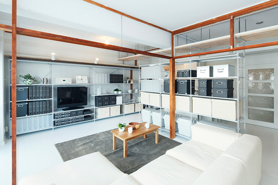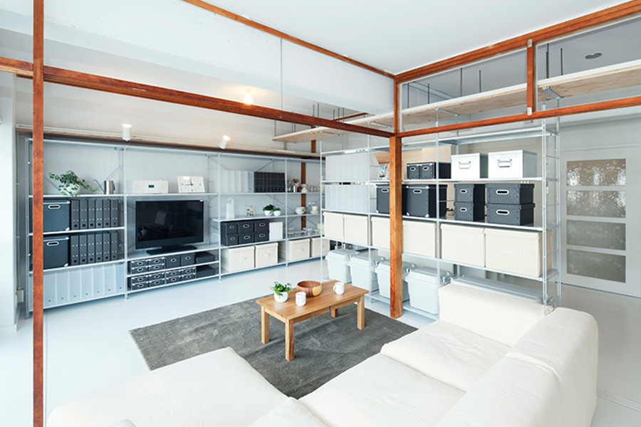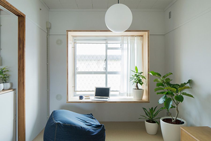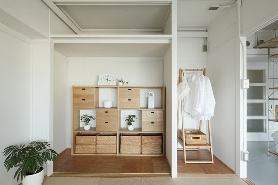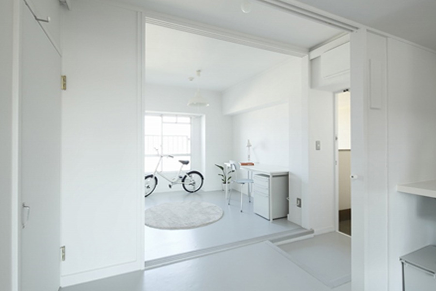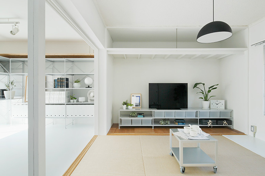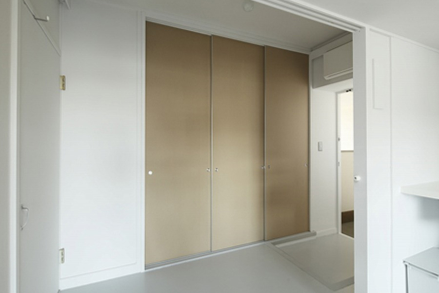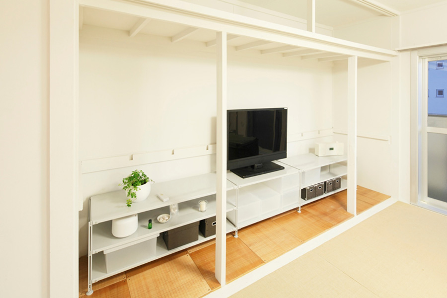- 以前は押入だった部分は、襖をはずして、部屋とつなげました。部屋の一部としても使えますし、収納としても使えます。また、押し入れのかたちはそのまま残して白く塗装することで、古い団地の記憶を残しました。
