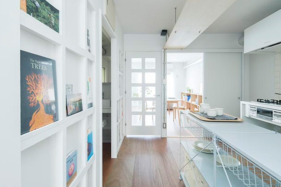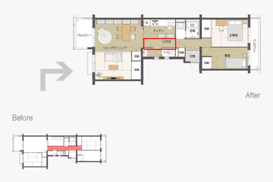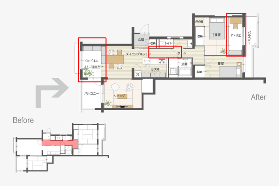 - この住戸の課題は、住戸面積に比して赤色の廊下部分の面積が多く、非効率な状況になっていました。今回のリノベーションでは、今まで蓄えてきたノウハウを展開しつつ、長い廊下だった壁にギャラリースペースという新しい提案をしています。これに併せて、閉鎖的だったキッチンをオープンにすることで、ギャラリーと併せて広いキッチン空間とし、空間のムダをなくしました。