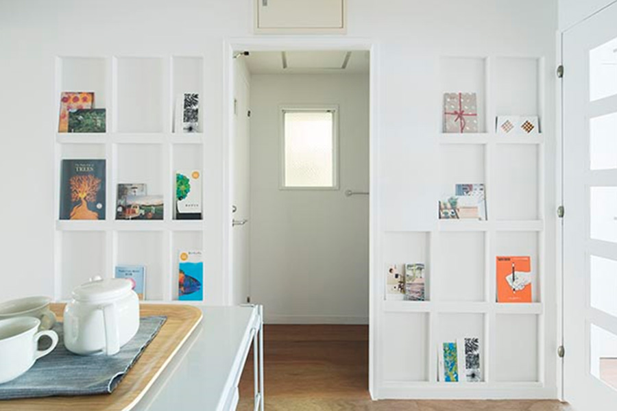 2枚目は正面から見た写真です。この奥に手洗いとトイレがあります。ギャラリーには、お気に入りの本や雑誌を置いたり、子供の学校での作品や写真、絵本、DMなどを置くことで、日常の生活を豊かにしてくれます。おおよそA4サイズであれば、このマスに入るので、煩雑になりがちなものがきれいに納まって見えます。