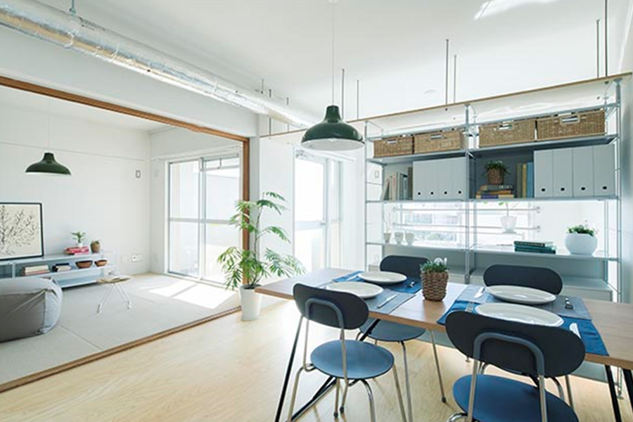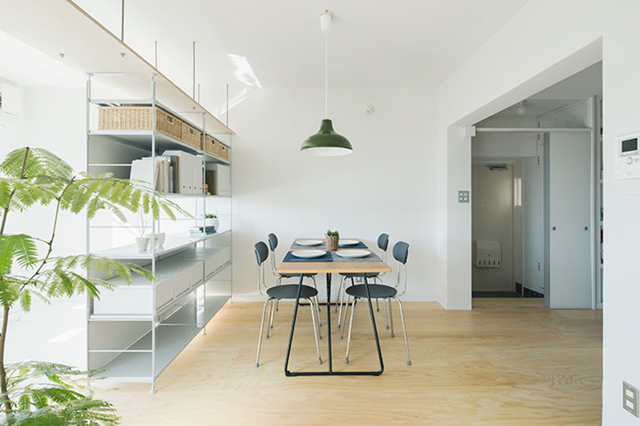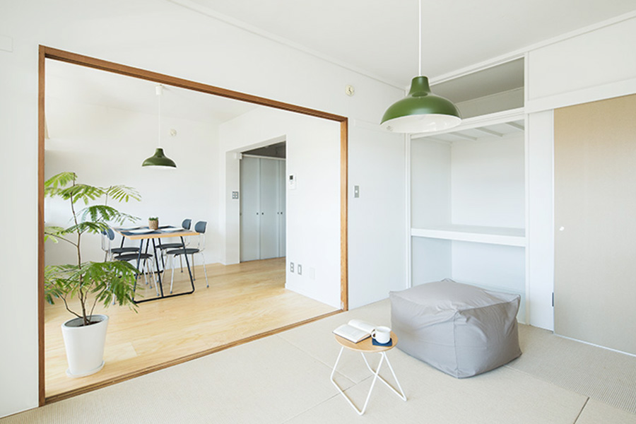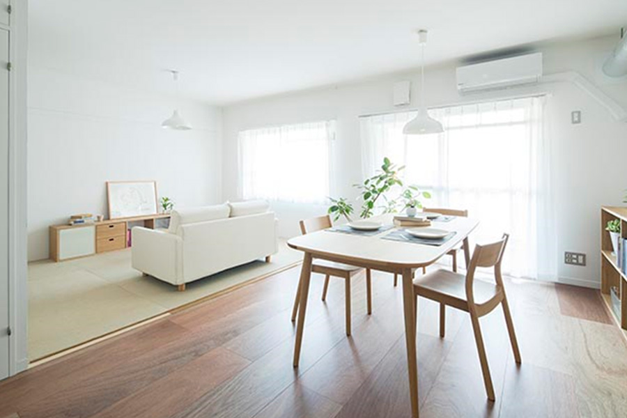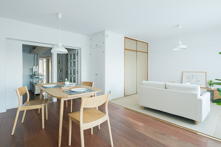 - 扉を開けると、開放的なリビング・ダイニング空間が広がっています。もともと和室だった部分は引き違いだけの小さな入口しかなかったので、壁全体を撤去して、南面間口いっぱいに広がるリビング・ダイニングとしました。団地とは思えないモダンな雰囲気になっています。