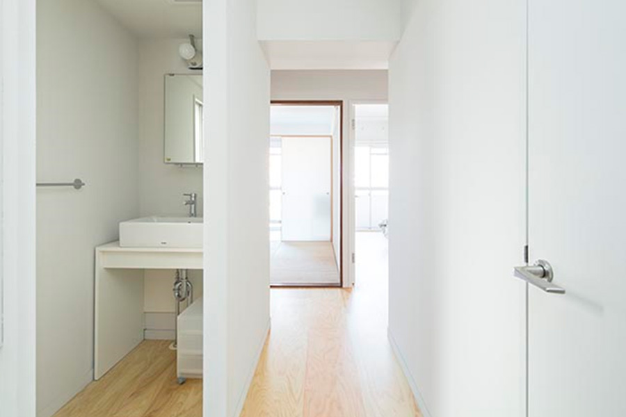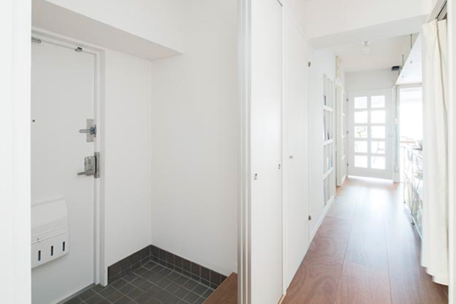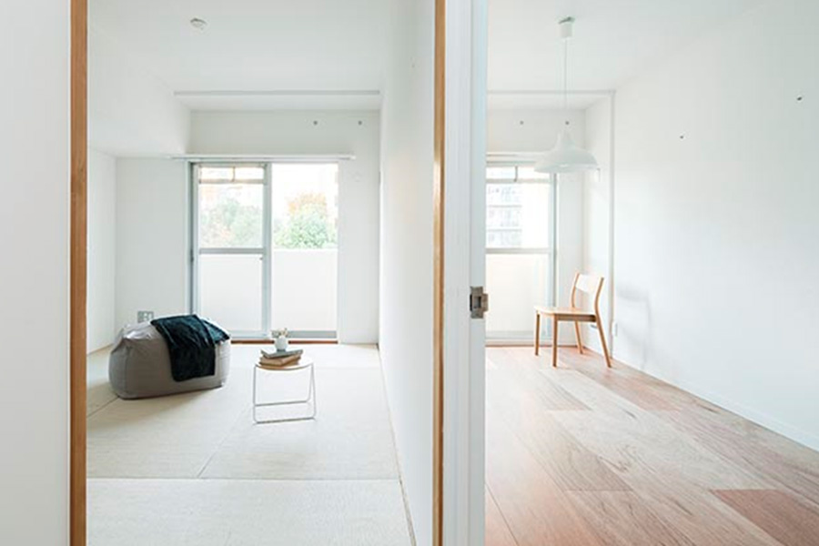 - 玄関です。廊下とキッチンをつなげたため、玄関の冷気がダイレクトに部屋に伝わらないよう、玄関をふすまで閉じられるようにしました。3枚の透過性のある半透明ふすまを使用していますが、これもまた後ほどご紹介したいと思います。2枚目の写真は、北側の2つの居室です。この間の壁は木軸でできているので撤去も可能でしたが、ファミリー層を考慮して2寝室つくれるよう壁を残しました。既存を残すということは、一番のコストダウンになります。