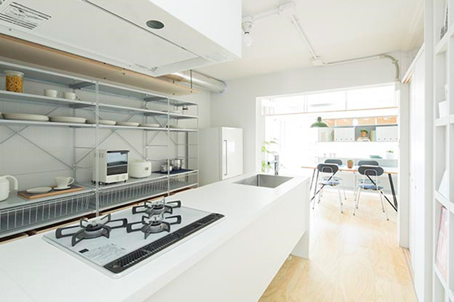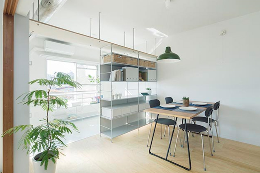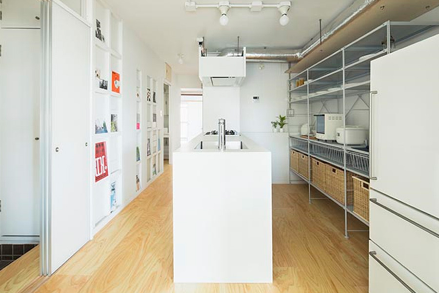 インナーテラスとダイニングの境目ですが、実は壁はありません。小天井と呼ばれる板のみ設置されていて、それを利用してシェルフを設置してゆるやかに空間を間仕切ります。床は、インナーテラス側は、白シートで床壁天井真っ白い空間となりとても明るいです。