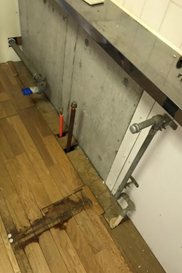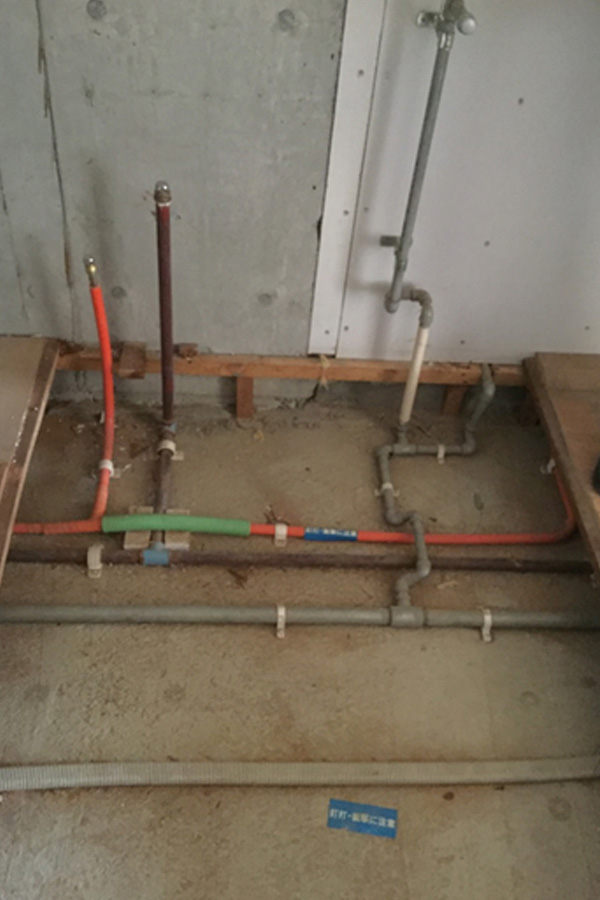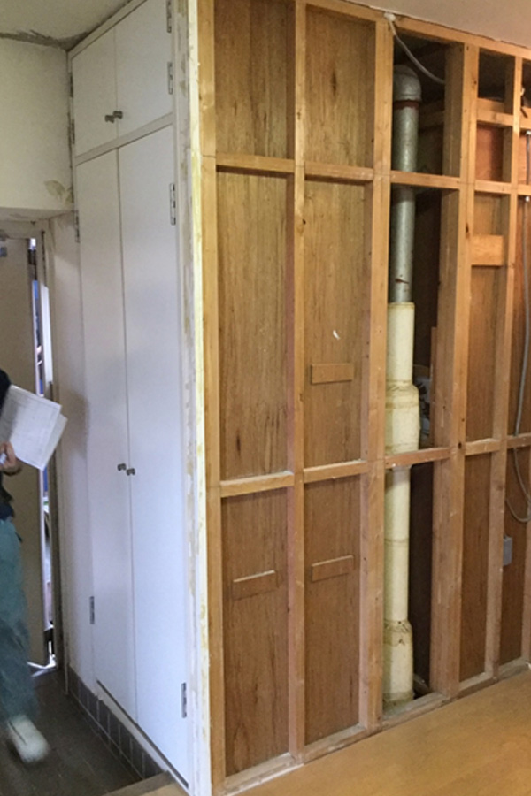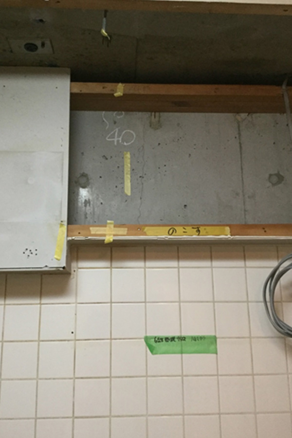 - まずは、キッチンまわりの施工です。まずキッチン、フードを撤去し、下地の状況確認をします。基本的な設備撤去後、仕上げとして何を残し、何を変えていくか現地で議論します。既存の配管ルートを確認の上、できるだけ床は残したまま、配管をどうするかなど施工者と共に確認をしていきます。