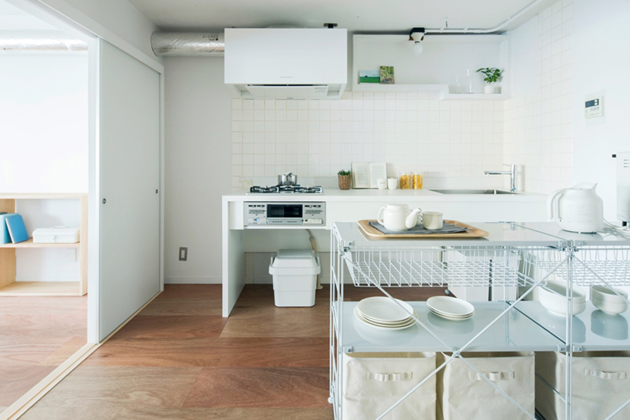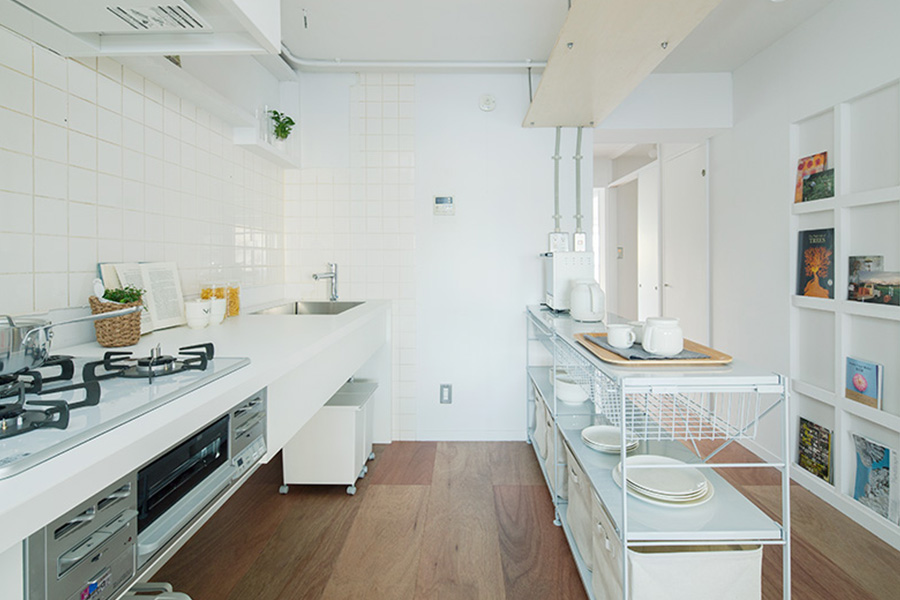 仕切りの壁を撤去し、廊下とキッチンを一体的にすることで明るい南北に通じる、明るい空間を生みだしています。