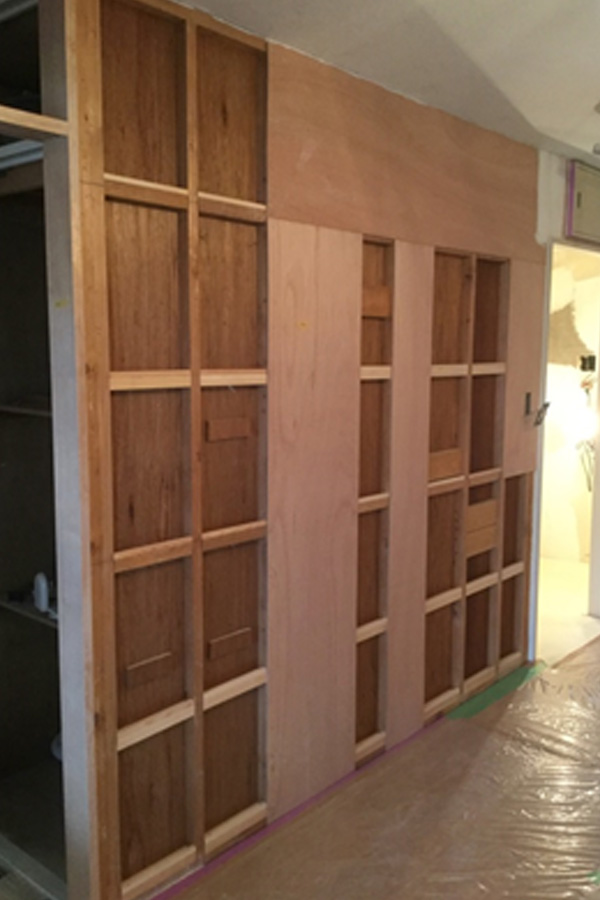 - 今回の大きな挑戦であるギャラリー部分の工事です。まずは壁の石膏ボードを外し、下地材の状況確認をします。施工者は丁寧に石膏ボードを剥がしてくれ、非常に良質な状態で下地材が見えてきました。見えなかった部分が見えてくる中で、見せるものと隠すものの確認をしていきます。奥行などを確認し、すべり止めとなる木を新しく設置することで、ギャラリースペースとして、生まれ変わりました。下地の上に白塗装を載せていきます。このように白くなるまで状況により、4回以上の重ね塗りを進めていきます。