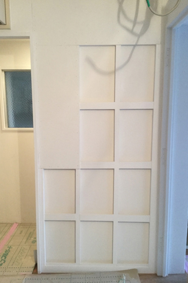 - 木部の表しもいろいろ検討しています。敷居、鴨居(かもい)、長押(なげし)や、木製仕上げの壁、建具が該当部分となります。若い木材なら、それほど影響はでないのですが、築40年近くになりますから、木部も日焼けや経年変化をしています。その結果、木のアクが表面上にあり、白色塗装をすると浮き出てしまう傾向がありました。それが浮き出てこないように、(きれいな白色になるまで)何度も重ね塗りを行っています。