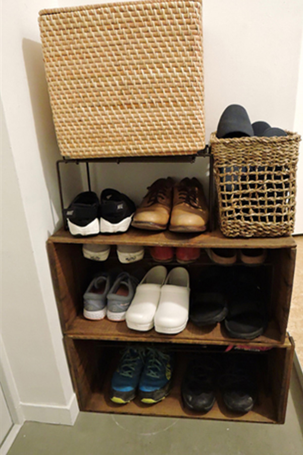 - リンゴ箱を下駄箱代わりにしたところ、ちょうど良いサイズでした。本当はもっとリンゴ箱を積み上げたかったのですが、数がなかったので、ラタンボックスを組み合わせてアレンジしました。