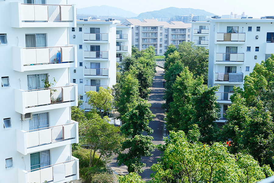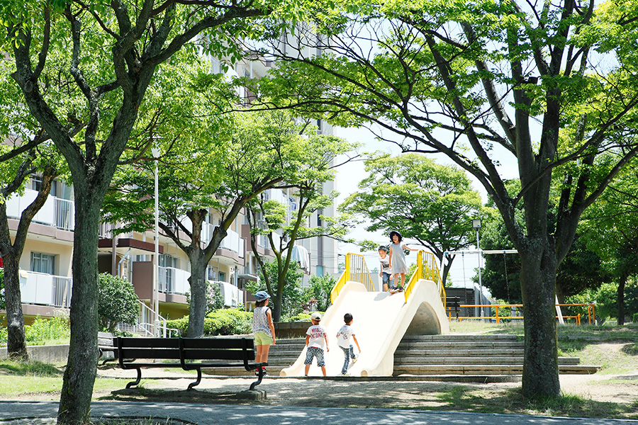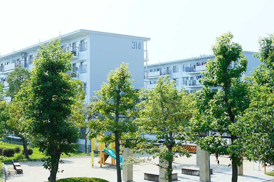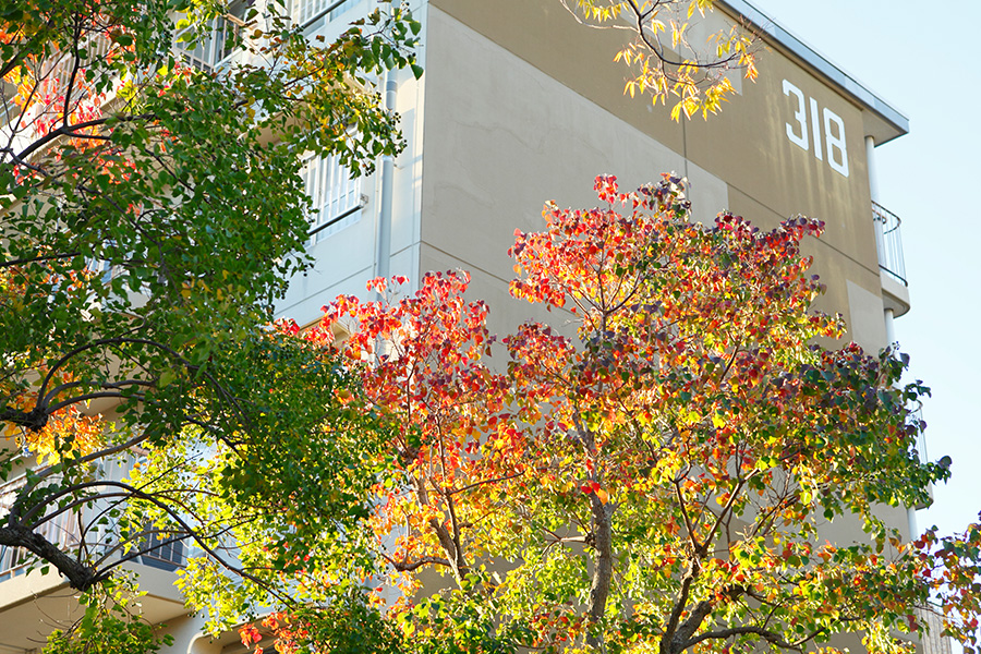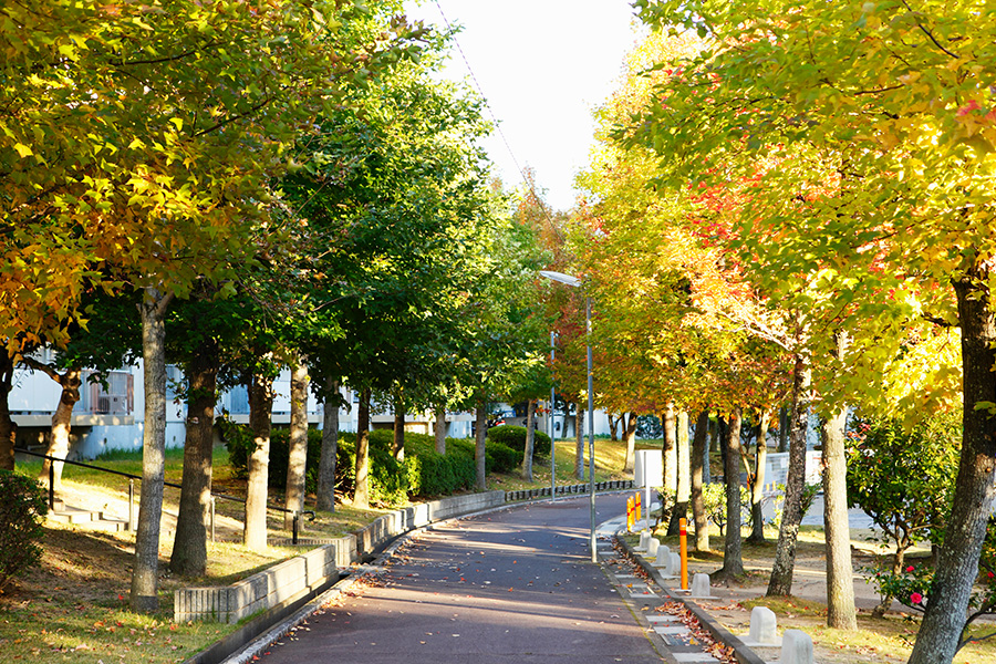 - 大阪の新千里東町団地が広場を中央とした囲み型の住棟配置なのに対し、神戸の落合団地はメインストリートとして並木道が団地を横断するように設計されていることが特長ですね。フウの木が植えられているのですが、紅葉の時期はとても美しいです。