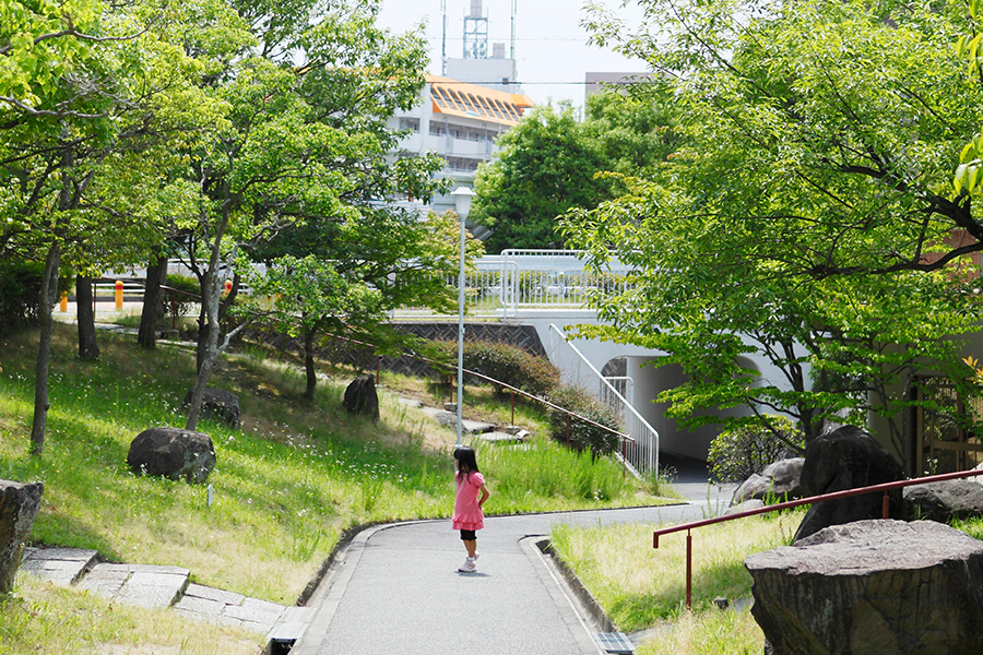 - こちらの団地も緑が多いですね。同じ緑でも、新千里東町団地は豊かな森のようでしたが、落合団地は遊歩道になった長い並木道が印象的です。この並木道は、団地の中だけでなく、周辺にもつながっているため、街全体が統一してつくられたニュータウンならではの景色だと感じています。車が通らないので、朝はときどきランニングをしていました。清々しかったです。