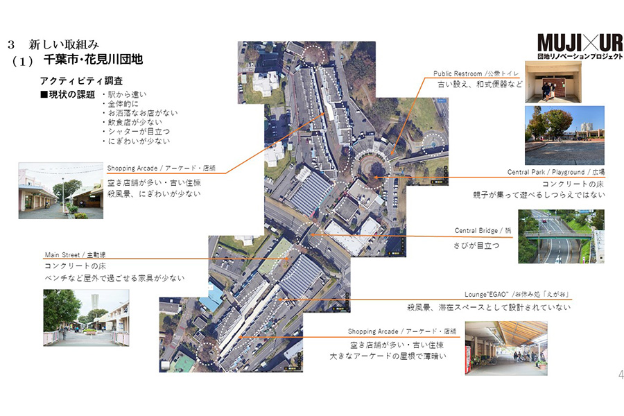 - その結果、商店街には非常に大きなアーケードがありますが、店舗が少なくなって空き店舗が目立つ状態になっていることなどがわかりました。調査も踏まえて課題を洗い出してみたところ、駅から遠い立地的な問題や全体的な老朽化というハード的な問題もあり、さらにはお洒落な店舗が少なく、店舗が増えない、賑わいもないという負のスパイラルに陥っていることがわかりました。そこをなんとか「MUJI×UR 団地まるごとリノベーション」に取り組むことで解決したいと考え、まず目的と設計指針を定めました。