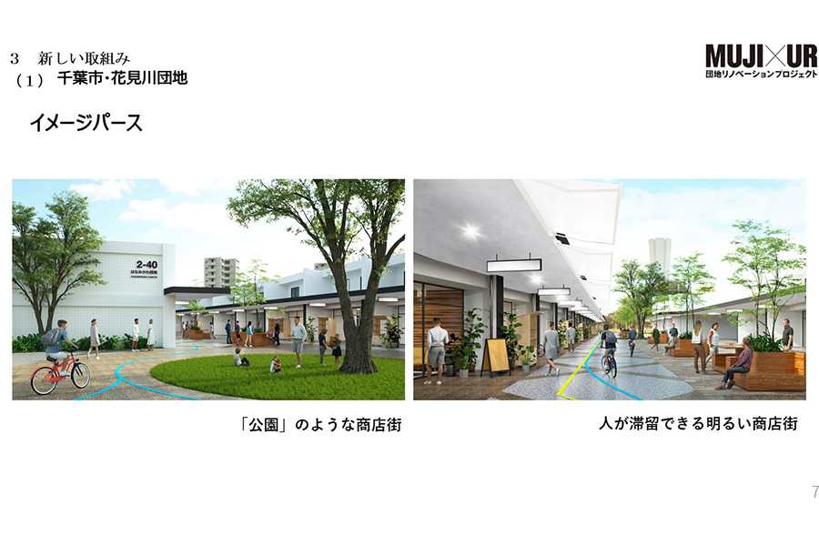 - まず2012年からスタートした「MUJI×UR 団地リノベーションプロジェクト」は住戸を中心としたリノベーションです。住戸をリノベーションするわけですが、それをきっかけに若い世代の方が団地に住み始めたりご高齢の方と若い世代の方の交流が増えたりと、改めて団地の魅力を知ってもらうこともありました。住戸のリノベーションによるMUJI×URの影響を感じてきました。そして2021年から正式な形で「MUJI×UR 団地まるごとリノベーション」と称して団地の住戸だけでなく周辺の施設や商店街などもリノベーションの対象として広げて地域コミュニティの形成にも取り組むことで団地を拠点とした地域の生活圏を活性化させるプロジェクトがスタートしました。