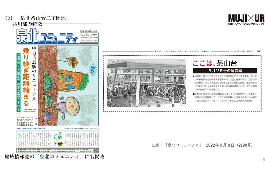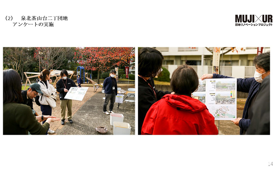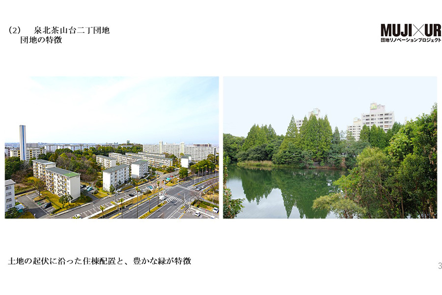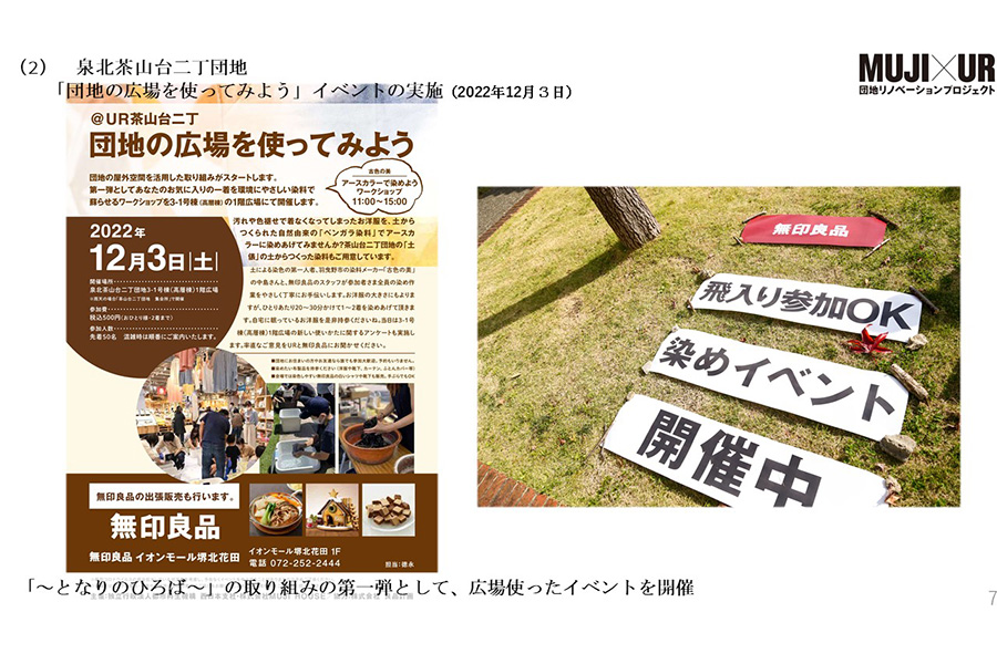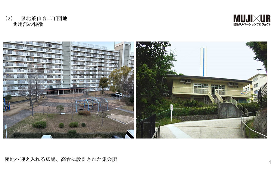 - 「となりのひろば」ではMUJI×URのスタート時に再発見した魅力でもある贅沢な屋外共用部をいつもただ通り過ぎてしまうだけだった場所から、もっと身近で思わず訪れたくなるような、みんなにとっての「となりのひろば」を作ることを目指して、居住者や地域の方々と一緒に新しい広場空間の使い方を考える取り組みです。段階的な屋外共用部の改修とコミュニティ形成に資するイベントを実施してまいります。この取り組みにおいても周辺のまちや人がつながるためのリノベーションのコンセプトは「こわしすぎず、つくりすぎない」ことです。これからこの「MUJI×UR 団地まるごとリノベーション となりのひろば」がスタートした堺市の泉北茶山台二丁団地と枚方市にある中宮第三団地の取り組みについてご紹介します。