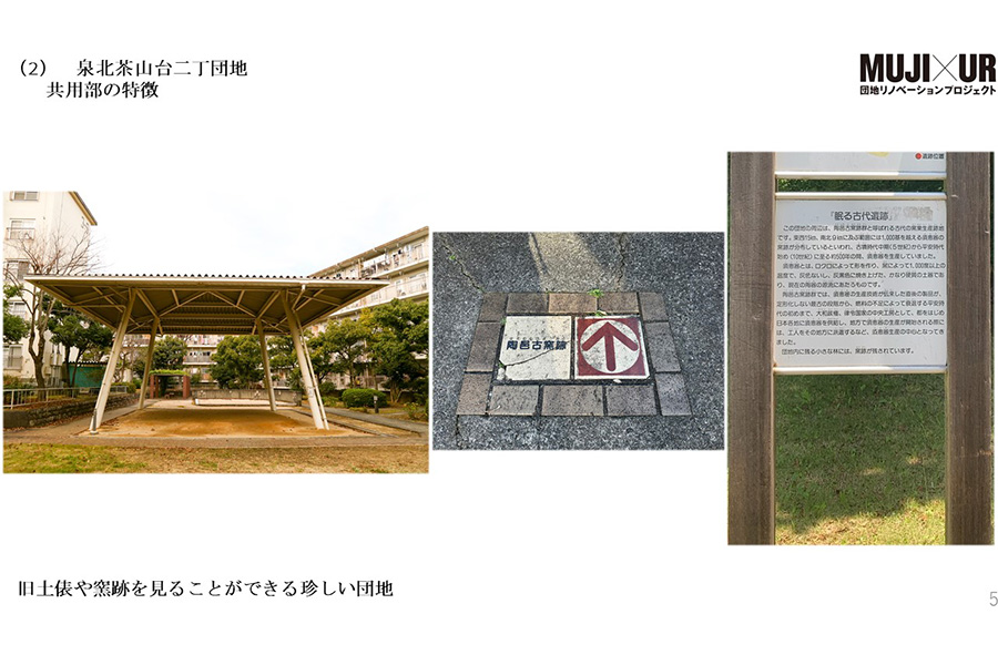 さらに敷地内にはかつて相撲で使われていた旧土俵を見ることができる非常に珍しい団地です。また泉北エリアではニュータウン開発工事に際に多くの窯跡が発掘された須恵器生産地であり、その窯跡も残されています。