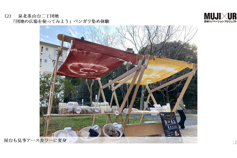 無印良品さんによる出張販売の実施やベンガラ染めと呼ばれる染物体験を行いました。 染物体験ではみなさんご自身の衣服を持ち寄り、ベンガラ染めという土の染料を使った自然由来の染色を行いました。今回は団地の旧土俵の土から取った染料も特別にご準備いただきました。