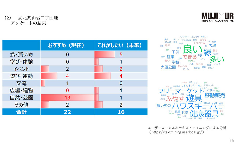 現在のおすすめできることについては「自然・公園」と答えてくださった方が多数を占めています。私たちがMUJI×UR発足時に再発見していた自然豊かであれという団地の魅力を居住者の皆様にも同じように感じていただいていたことがわかりました。団地の未来に関する項目では「食・買い物」、「遊び・運動」を楽しみたい回答が目立ちました。