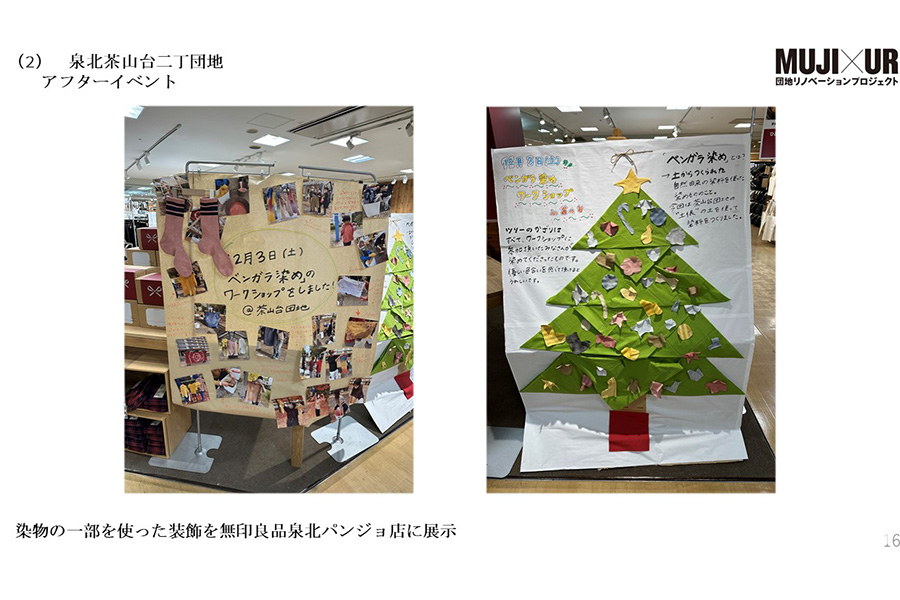 - 「団地のひろばを使ってみよう」イベント後の取り組みについてご紹介します。近隣にある無印良品泉北パンジョ店の店内の様子です。イベントにご参加いただいた方に作っていただいた染物をクリスマスツリーの装飾として飾りつけをし、店内に展示いただきました。MUJIさんと連携しているからこそできた泉北茶山台二丁団地の活動をより多くの人に知ってもらえる取り組みとなりました。