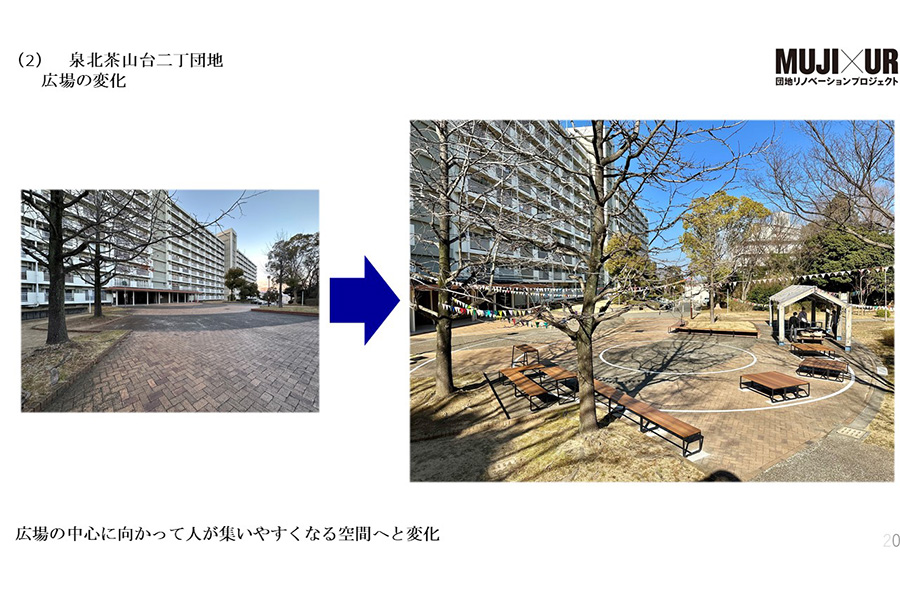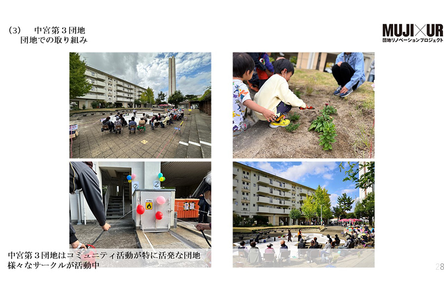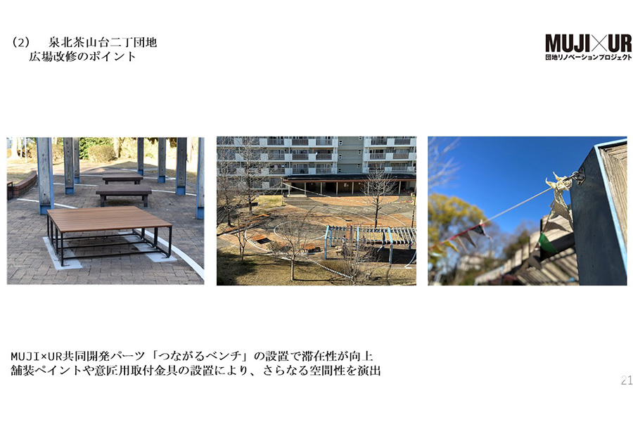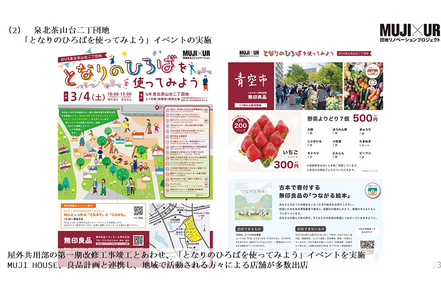 - このように「MUJI×UR団地まるごとリノベーション となりのひろばを使ってみよう」の取り組みでは泉北茶山台二丁団地と中宮第3団地で定期的なイベントやワークショップを実施していく予定です。このような取り組みを通じて今ある団地らしさやコミュニティを大切にしたうえで皆様と一緒にとなりのひろば作りを考えていきたいと思います。以上を持ちまして「MUJI×UR 10周年記念トークイベント『これまで』と『これから』」を終了します。今後も最新情報はウェブサイトなどをぜひチェックしてみてください。本日はご清聴ありがとうございました。