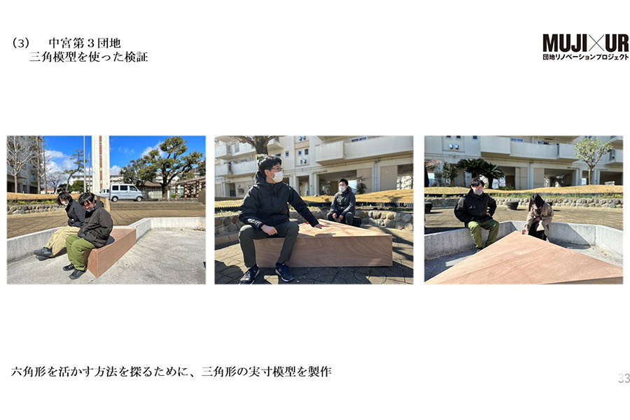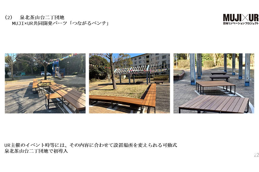 - 広場改修のポイントの1つ目は組み合わせ自由なMUJI×UR共同開発パーツ「つながるベンチ」の設置です。