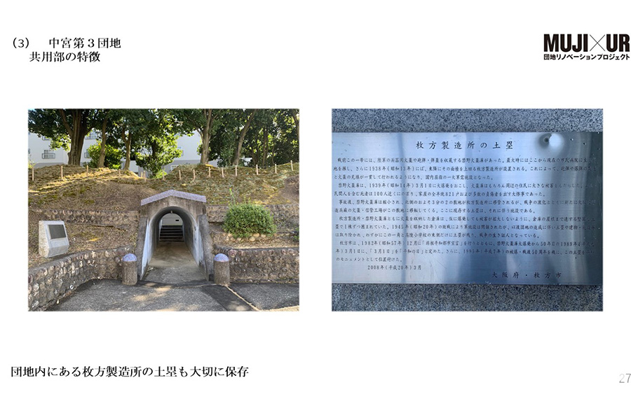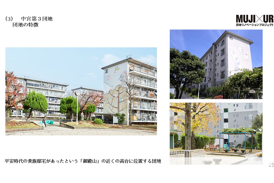 - 続いて大阪府枚方市にある中宮第3団地の取り組みです。ここは平安時代の貴族の邸宅があったとされる御殿山の近くの高台に位置する団地でこの付近の「禁野」という地名は貴族以外の狩猟を禁じていたことが由来となっているなど、貴族文化の歴史を感じることのできるそんなエリアに立地する団地です。
