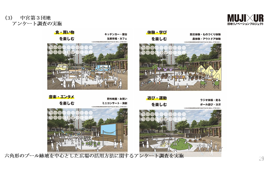 - 中宮第3団地においても昨年秋に実施されたイベントで今後どのような広場空間を目指すべきなのか検証するためのアンケートを実施、広場で楽しみたいことを投票いただいています。