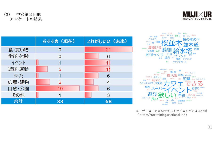 アンケートの結果では現在の団地のおすすめできる場所としては「自然・公園」と答えてくださった方が多数を占め、団地の未来に関する回答は「食・買い物」という回答が目立ちました。