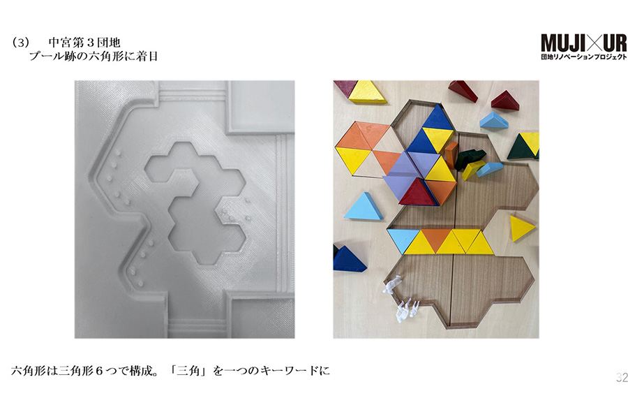 - こうして中宮第3団地の広場活用を考えるなかでこのプール跡地の六角形をさらに分解してみると参画が集合していることに気が付きました。そこで三角を一つのキーワードとして地域の方々と居住者の皆様でイメージを膨らませました。