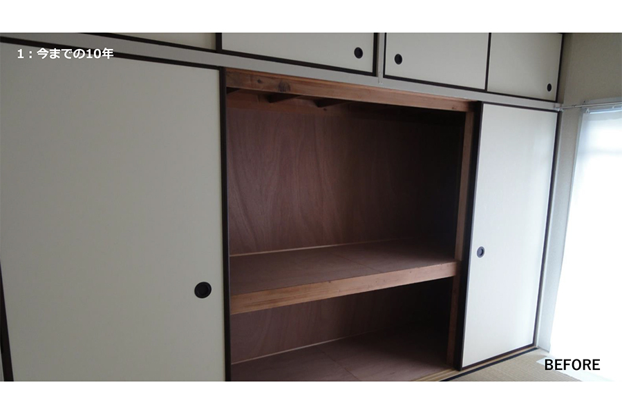 - 例えば、押し入れです。押し入れの中、棚を取って白く塗り、居室の延長線上としても、家具を置けば収納としても使えます。ここでも可変性を少しだけ表現しているかなと思います。 なおかつ、コストもかけない。壊しすぎてしまうと、コストがかかってしまうので、最低限の壊し方を考え作りました。