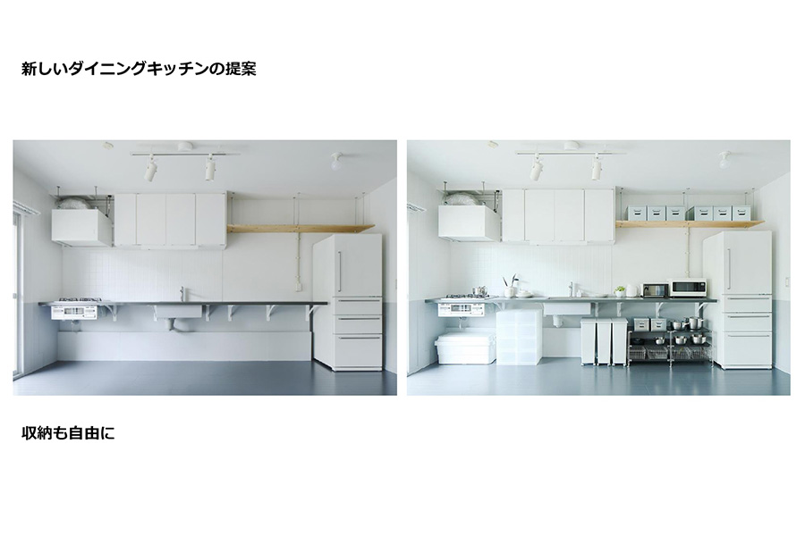 - あとキッチンの収納ですね。収納も料理をされる方は当然必要だと思うのですが、あまりしない方はそんなに必要ないということもあるのではないかなということで、収納も自由にしています。収納が必要であれば、全部無印の商品のラックですが、こういったものを入れていただいて、自由にここもカスタムにしましょうと。使わない人はもうこのままで広々と見えるし、こういう使い方もあるのではないかなという仮説を立てて、 作っていきました。