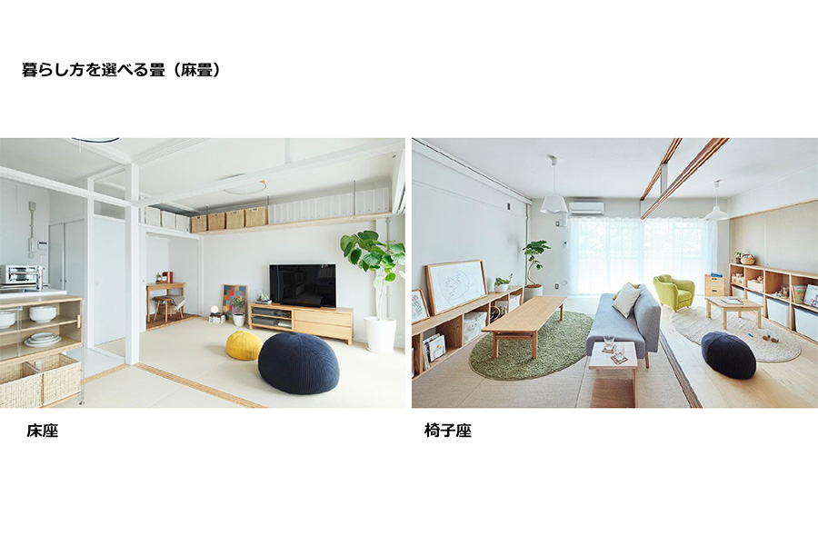 左側は、普通の畳の使い方と同じく、ゴロゴロしながらテレビを見たりとかということも、もちろんできます。右側は椅子座での暮らしで、ソファやテーブルを置いてもへたりにくい強い素材の麻で作っているので、こういった洋風な暮らし方もできますし、昔ながらの畳での暮らし方もできます。こちらも住む方が自由に選べるようになっています。