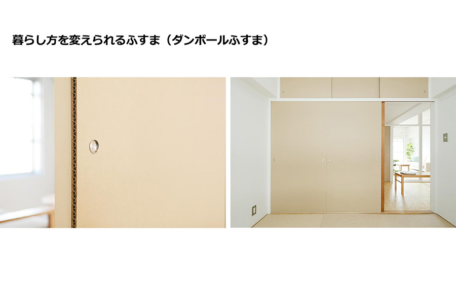 団地の和室をどういう風に変えていくのがよいかを考えた時に、ダンボールを使ったふすまを考えました。ダンボールと言っても、梱包用のダンボールではなくて、非常に強い「強化ダンボール」というものを使用しています。本気で切ろうとしたらノコギリなどを使わないと切れない強い素材となっています。ダンボールなので非常に軽く、取り外しが非常に簡単にできるという特徴があります。