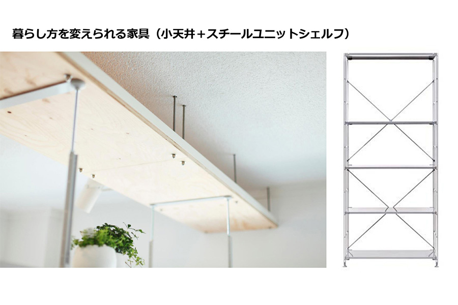 そして、ここに「小天井」と呼ばれる、ちょうどスチールユニットシェルフが突っ張れる高さで、天井を作ったりしています。