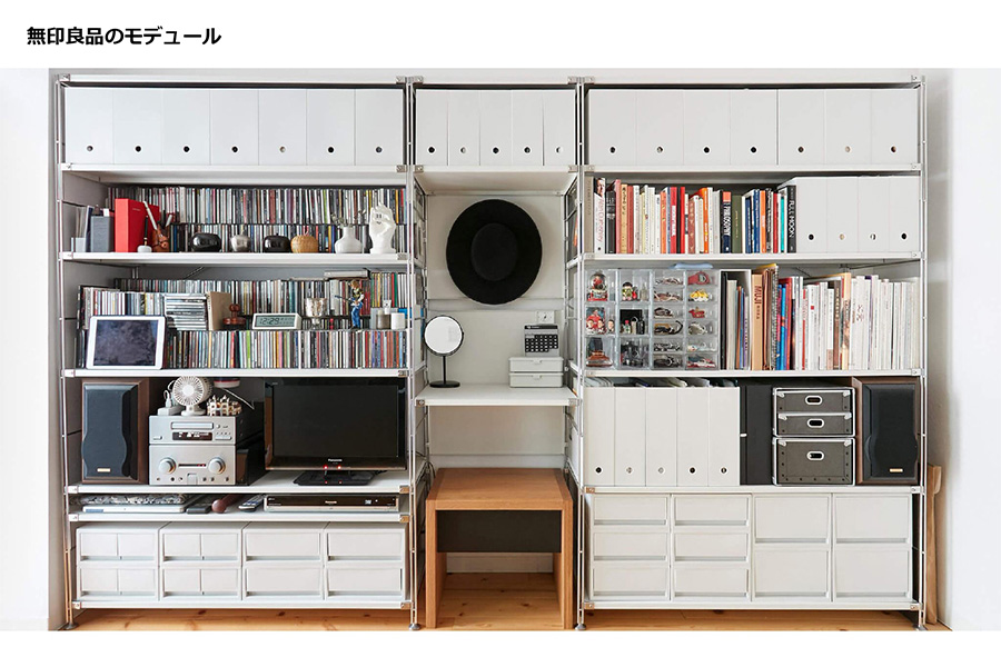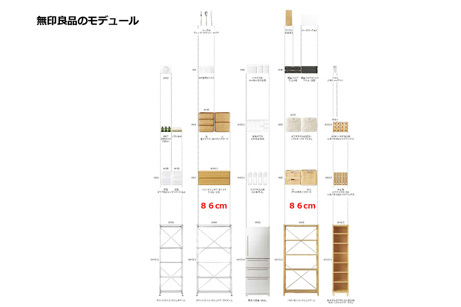 寸法の話なのですが、無印良品の先ほど言ったこのスチールユニットシェルフなどは、収納も幅が86cmというモデュールを使っております。