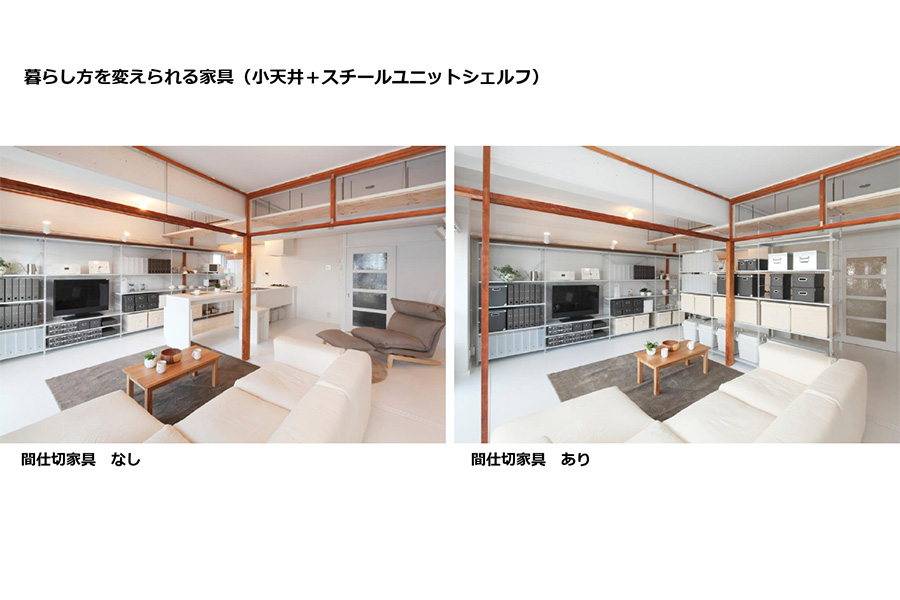 先ほどの間仕切り家具がない場合というのは、こういったように一体的に使うことができますし、KEPの考え方と似ているかもしれませんが、ちょっと間仕切りたい時は、スチールユニットシェルフを使っていただいて、そこにぴたっと収納を入れていただくことで、間仕切りの代わりにすることも選べます、ということを大事にしています。