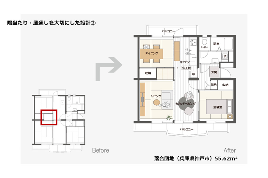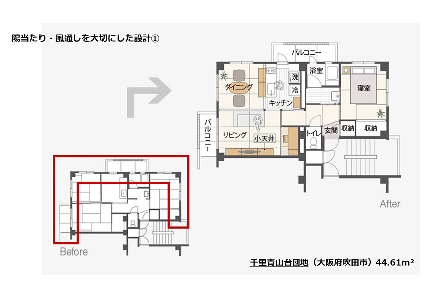 左下がビフォーの状態で、右がリノベーションした後の状態です。こちらは、大阪の千里青山台という団地でやらせていただいたものです。