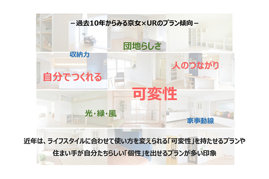 井上先生からお話いただきました「京都女子大学×UR」ですが、実はコンペという形で毎回プランの選定を行っているのですが、10年間実施する中で、学生さんから下記のキーワードが、共通して出続けていることが分かりました。