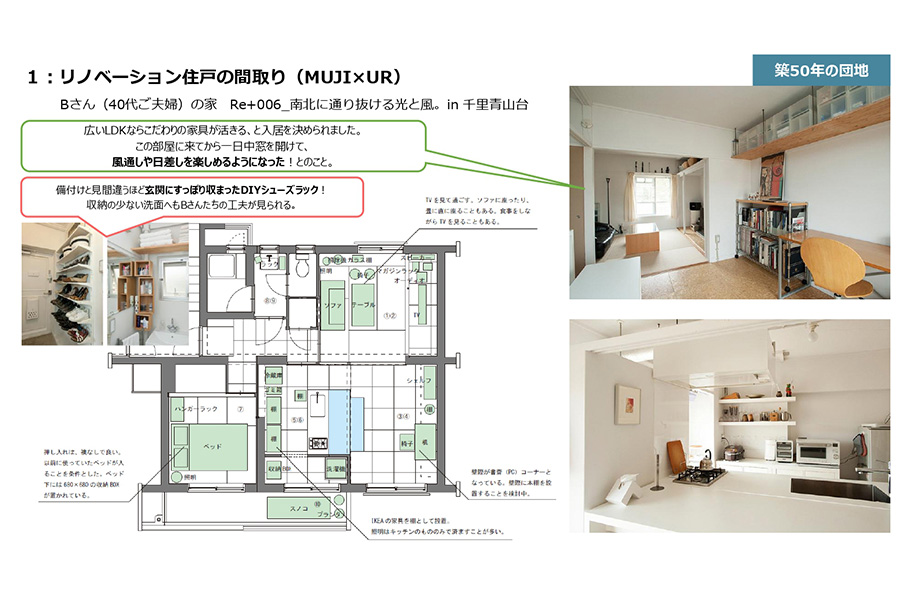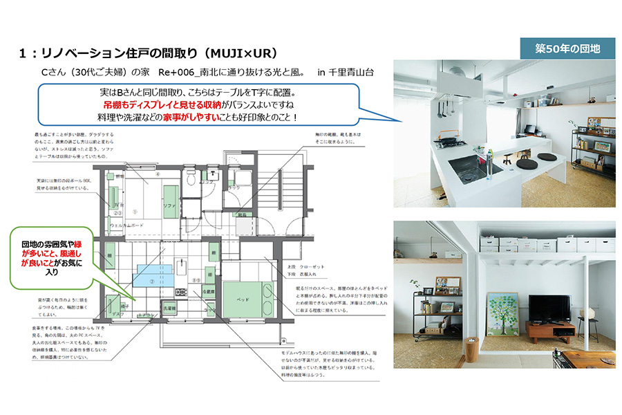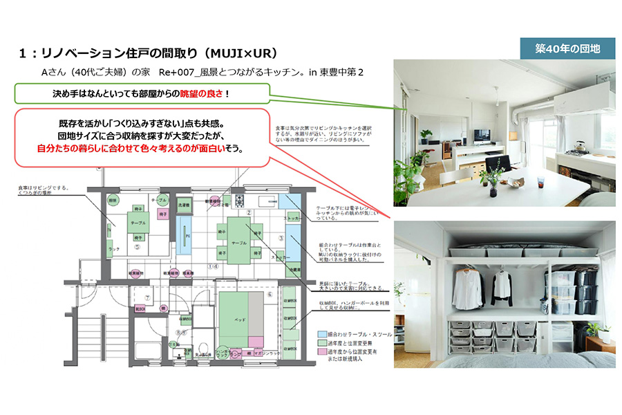 続いて、「MUJI×UR」にお住まいの方にもヒアリングをしました。こちらのプランには「南北に通り抜ける光」というテーマがついています。先ほど豊田さんから紹介いただきましたが、「MUJI×UR」のプランにはこういったタイトルが、全70プランについています。こちらにお住まいの方は、モデルルームのように住んでいただいていて、私どももびっくりしています。