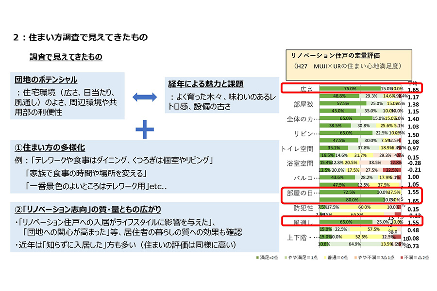 また、リノベーションされたお部屋に住みたいという方も多様化してきています。そのリノベーションされた部屋に住むことで、ライフスタイルにいい影響があったという方がいる一方、「リノベーションしていたの?」と知らずに入居した方も最近増えてきています。質、量ともにリノベーションが団地全体に浸透してきている、そのような流れになっているのかなということが見えてきました。