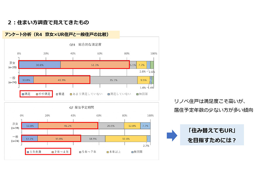 このグラフは「京都女子大学×UR」でリノベーションされたプランと一般住戸との比較を示しているのですが、リノベーションをした方が「満足」、「やや満足」と答える方がやはり多くなり、満足度が高く住んでいただいています。