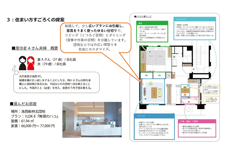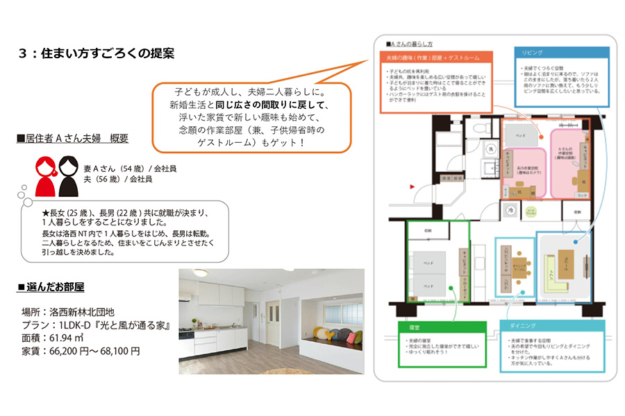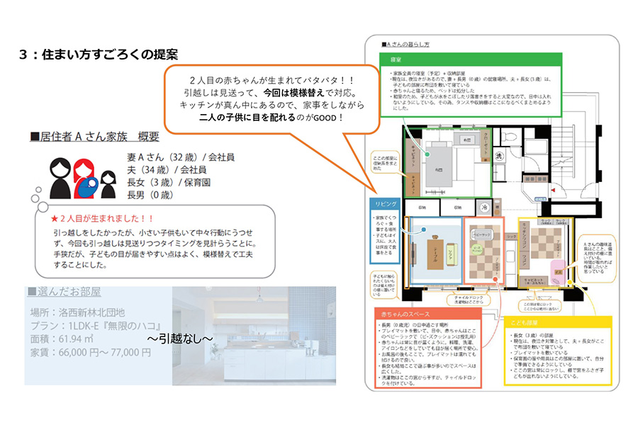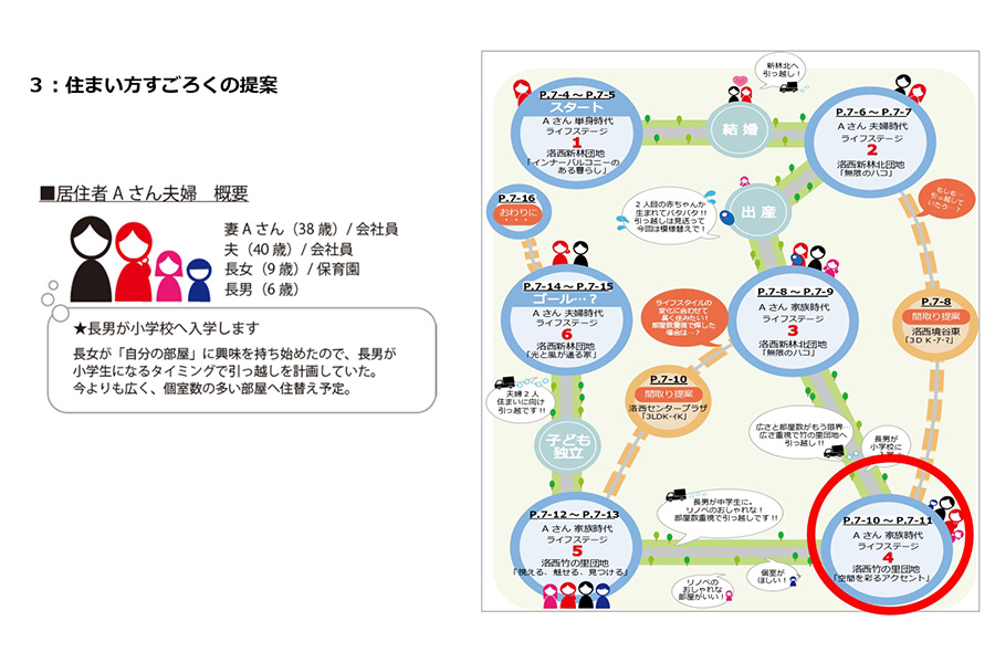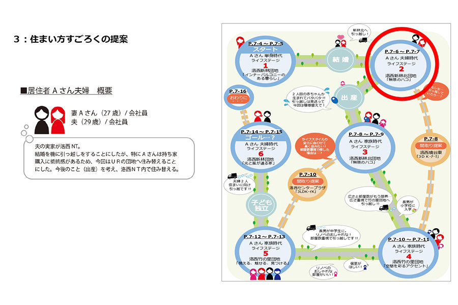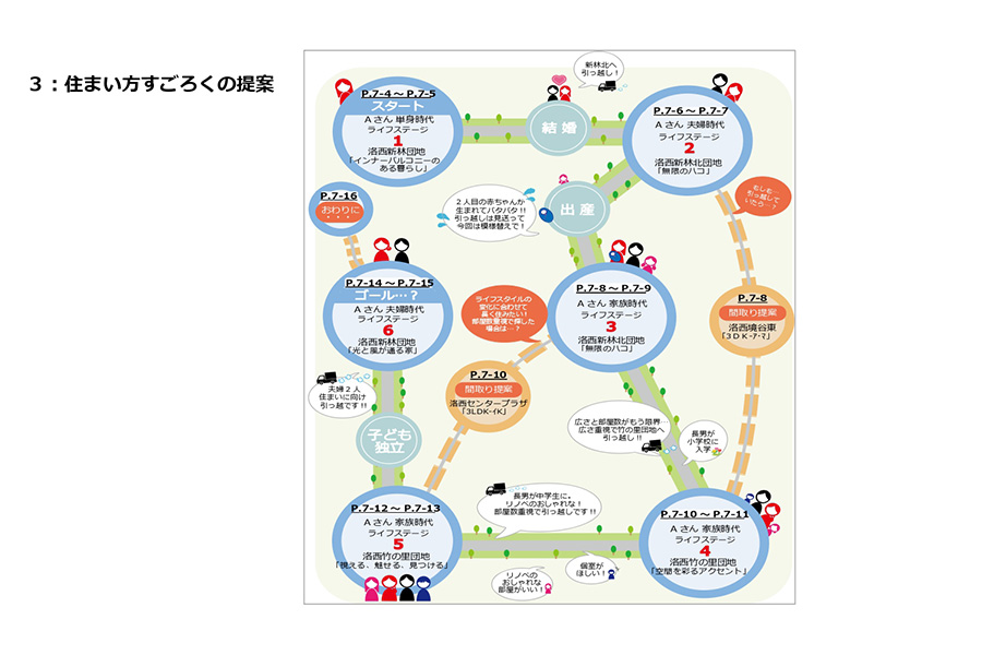 具体的には、ライフステージが変化するタイミングで住まい方が変わり、今のお部屋に住めないという方についても、あえて所有しないという選択肢をなるべくいっぱい作っていく。 そうしたことで、着替えるように自分の気分に合わせて住み替えるということが1つの団地、あるいは1つのエリアでできたら、URにずっと住んでいただけるのではないかということで「住まい方すごろく」というものを考えてみました。