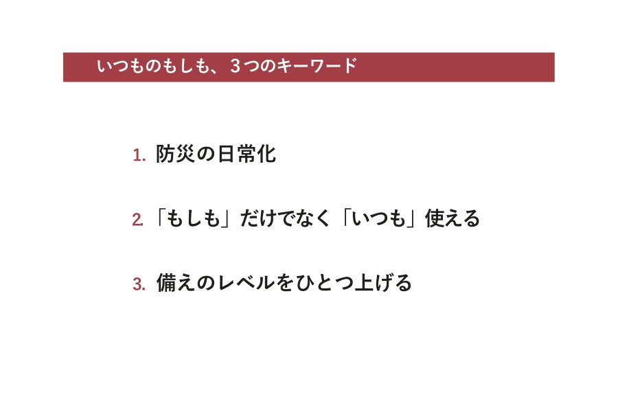 我々がお伝えしている「防災の日常化」は、「いつも」も「もしも」も境なく普段の生活で、今、何かが起きても、普段使っているもの、もしくは普段使っている知恵の延長で「もしも」に対応できることを身につけていただくことを目指しており、そういった「もしも」にも使えるような商品を皆さまにも日常的にお使いいただくことを活動の中で紹介しています。
