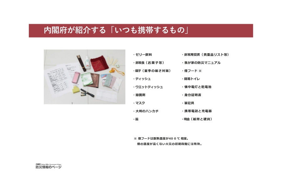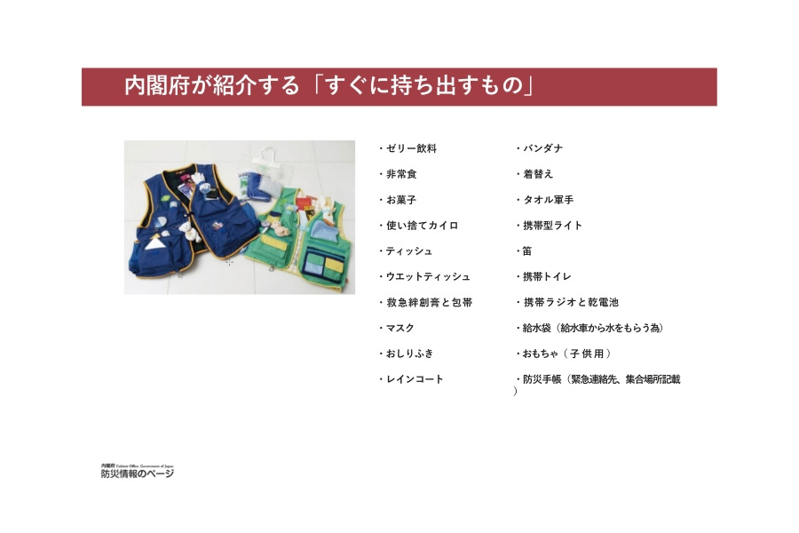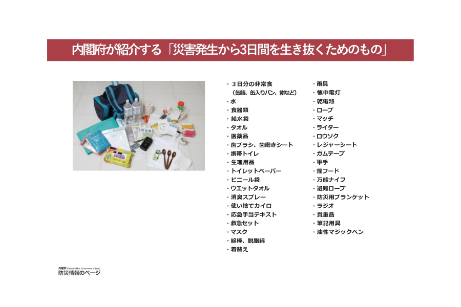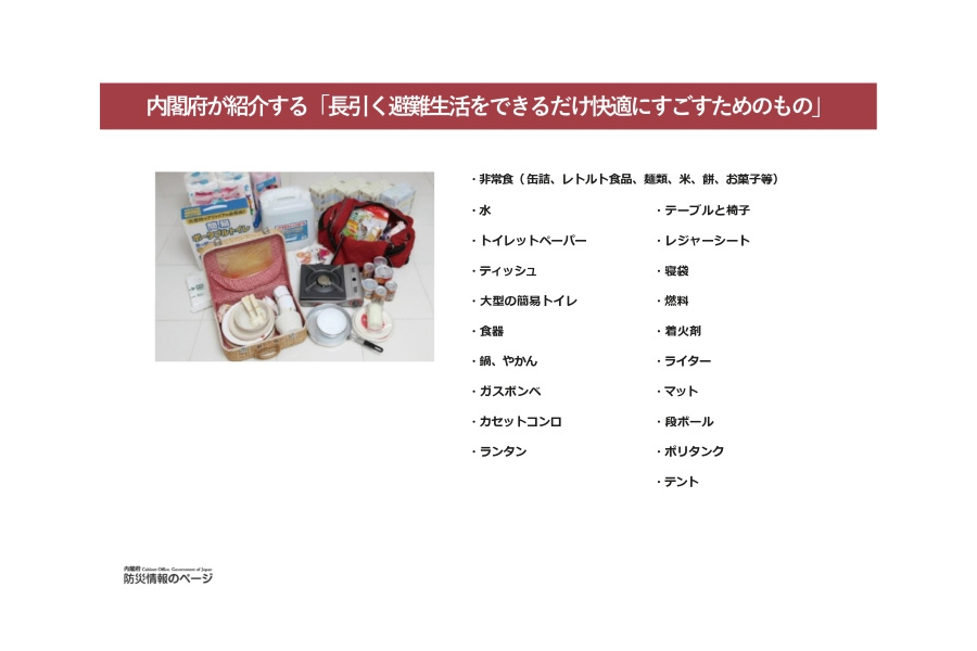 そんな中、内閣府がいつも携帯するものやすぐに持ち出すもの、発生から3日間を生き抜くためのもの、さらにはその避難生活が長引いた時に必要になってくるものなどをこういった防災情報のページで紹介しています。