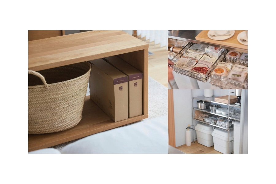 「備える」と書いてあるものは自宅避難用の防災セットです。防災セットも、いわゆる銀色やオレンジ色のバッグでなんでも詰め込まれているものではなく、本棚などに置いてあってもあまり違和感ないようなものにしています。赤い消火器はふだんの暮らしではインテリアに馴染まないので、ついつい奥に追いやってしまうということがあるかと思います。消火器を白くすることによって、日常の中に置いておくというような見た目の工夫をしています。