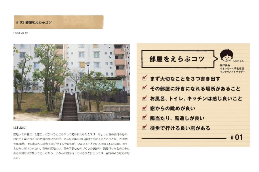 こちらが初回の記事になるのですが、住まいを選ぶときにどのようなことを考えたらいいか?というのを1年間ずっとブログで配信していたのが団地との深い関わりです。
