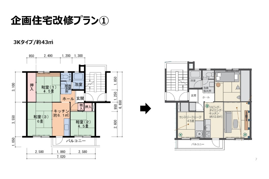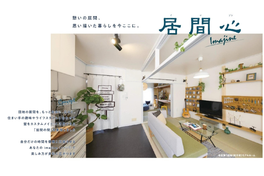 - まず1つ目ですが、「居間心(いまじん)」と呼んでいる企画住宅です。こちらの企画ですが、昭和40年代の3K、43㎡ぐらいのお部屋をリノベーションしたお部屋となっており、主に43㎡の部屋に1人で住んでもらおうということで企画をしました。
