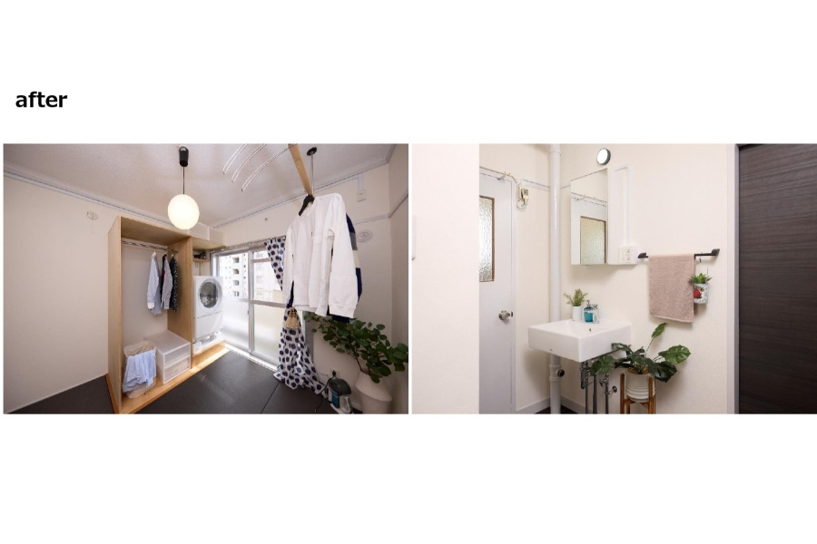 その分、洗面台の横にあった洗濯機のスペースは何もなくなったので広々としています。こちら資料ではグリーンを置いていますが、無印良品のラックを置いていただくこともできます。