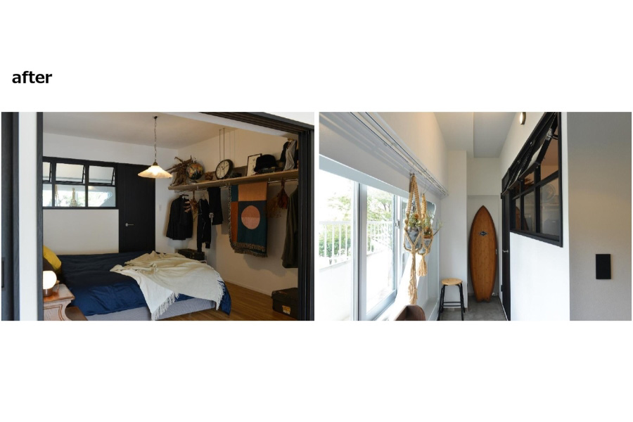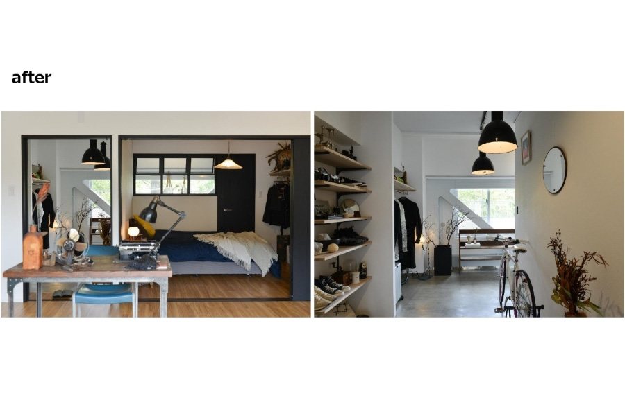 - リノベーションしたお部屋の一例がこちらです。玄関周りは土間を大きく広げ、趣味の道具などを置くことができるスペースにしました。