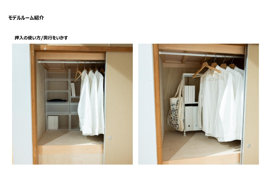 - その場合は資料のように、前後収納をおすすめしています。前方にはお洋服をかけて、後方には先ほど紹介しました、37・26というモジュールの26cmの奥行きの薄い方のものを後ろに入れてみます。本棚にしてみたり、シーズンオフの洋服などを入れることができます。こちらもモデルルームの押入れで展開をしていますので、よろしかったら見てみてください。
