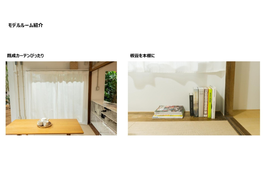 - モデルルームを作る時もカーテンを入れています。カーテンをオーダーすると大体2~3週間ぐらいかかってしまうのですが、団地の窓のサイズは標準なので、店舗で売っているカーテンをそのまま使うことができます。モデルルームの撮影が翌日に迫っている時もとりあえず店舗に買いに行ったら売っているので安心します。