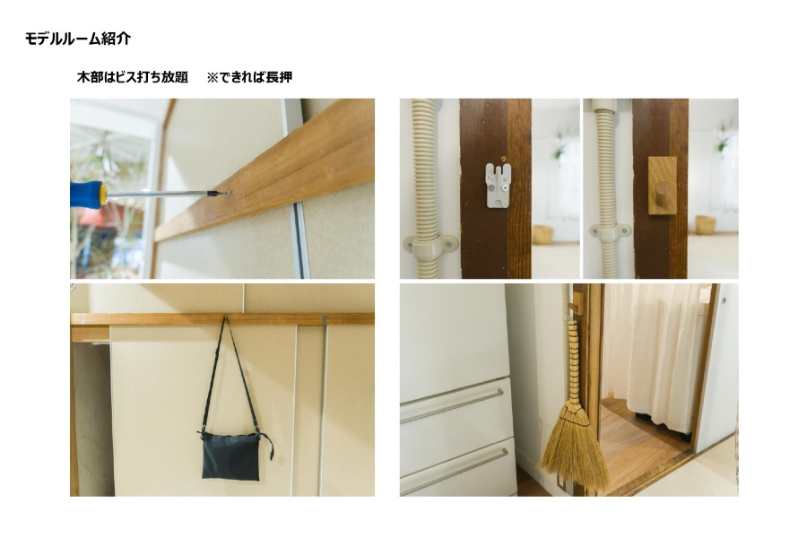 ただ、団地では木部にビスを打っても良いとのことでしたので、モデルルームのいろんなところにビスを打ってみました。